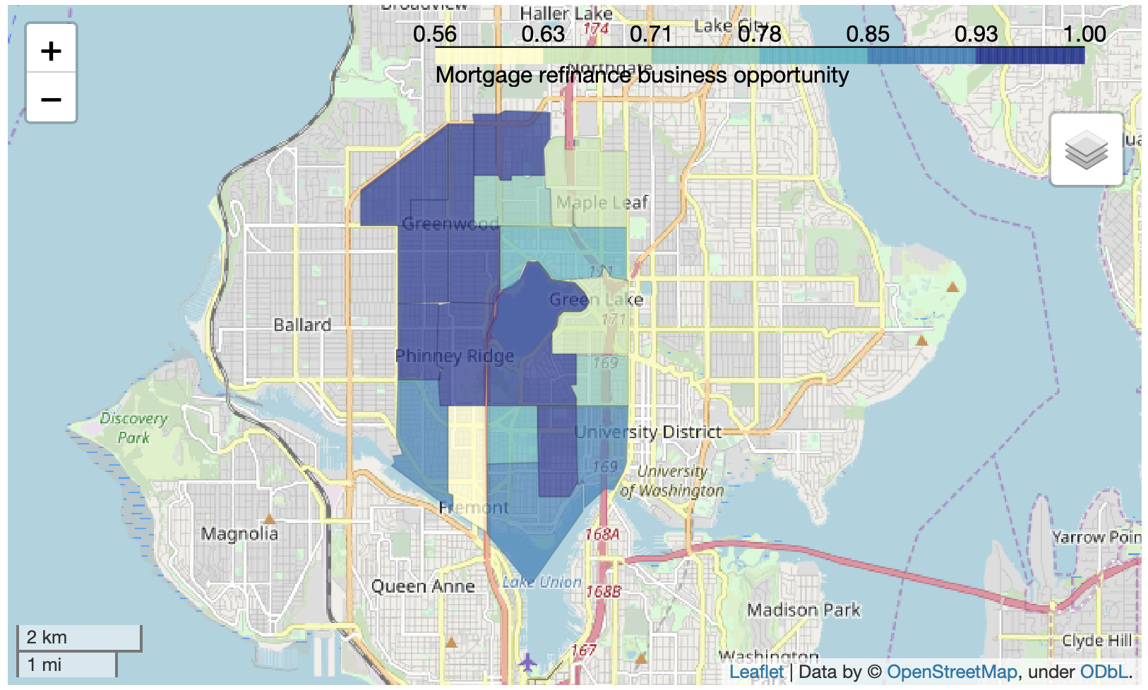 intelliRefinder (demo) is a product using machine learning algorithm to categorize the mortgage refinance business opportunities in given areas. It helps non-bank mortgage lenders to actively identify refinance business opportunities in target area and would save mortgage lenders time and money for optimizing their marketing strategies. Please click here for more details.